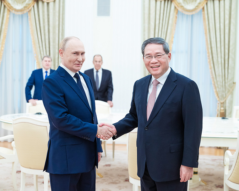 李强首先转达习近平主席对普京总统的亲切问候和良好祝愿。李强表示,今年以来,两国元首两度会晤,在中俄建交75周年的历史节点上,为进一步深化双边关系与合作擘画新的蓝图、注入强劲动力。中俄关系稳定发展,不仅符合两国和两国人民的根本利益,也有利于地区乃至世界的和平、稳定、繁荣。中方愿同俄方一道,落实好两国元首重要共识,保持双边关系良好发展势头,不断拓展全方位互利合作,取得更多务实成果。